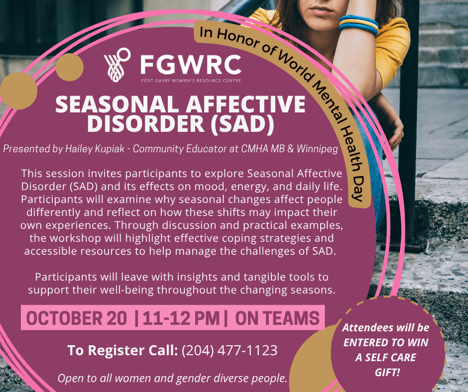 This session invites participants to explore Seasonal Affective Disorder (SAD) and its effects on mood, energy, and daily life. Participants will examine why seasonal changes affect people differently and reflect on how these shifts may impact their own experiences. Through discussion and practical examples, the workshop will highlight effective coping strategies and accessible resources to help manage the challenges of SAD. Attendees will leave with insights and tangible tools to support their well-being throughout the changing seasons. Attendees will be entered to win a self-care basket in honor of World Mental Health Day!