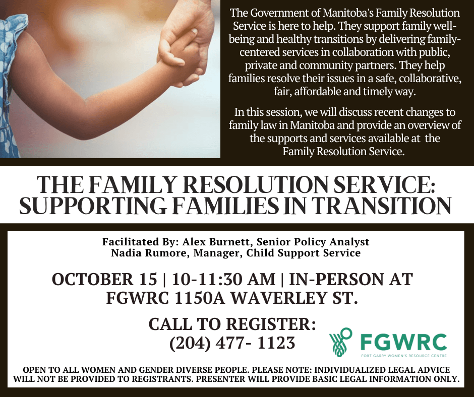 The Government of Manitoba’s Family Resolution Service is here to help. They support family well-being and healthy transitions by delivering family-centered services in collaboration with public, private and community partners. They help families resolve their issues in a safe, collaborative, fair, affordable and timely way. In this session, we will discuss recent changes to family law in Manitoba and provide an overview of the supports and services available at the Family Resolution Service. Please note: Individualized legal advice will not be provided to registrants. Presenter will provide basic legal information only.